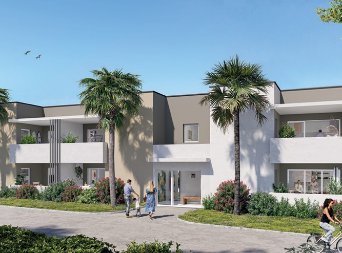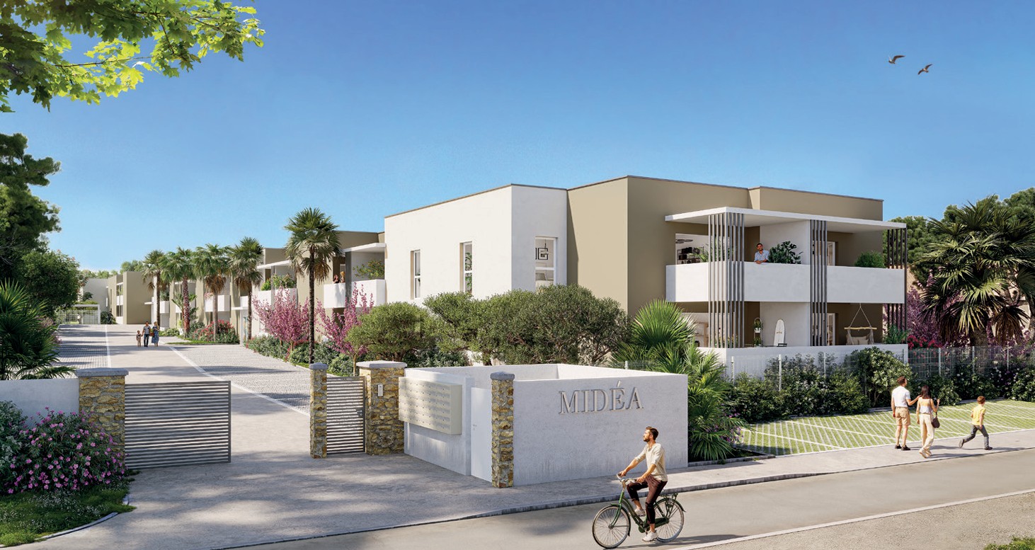 La résidence Midéa à Marseillan incarne une nouvelle façon d’habiter, où élégance contemporaine et art de vivre méditerranéen s’unissent avec harmonie. Avec ses lignes épurées et son écriture contemporaine, la résidence affirme une architecture sobre et lumineuse, ouverte sur un environnement paysager soigné. Ses tonalités taupe et blanches soulignent son élégance naturelle, tandis que les espaces de pleine terre accueillent palmiers et essences locales, dans un esprit parfaitement adapté au climat méditerranéen. Pensée pour offrir simplicité d’usage et qualité de vie au quotidien, la résidence propose des circulations fluides, largement ouvertes sur les extérieurs verdoyants. Les accès piétons et véhicules, subtilement en retrait du trottoir, garantissent calme et sécurité, complétés par la présence d’un local à vélos pratique et fonctionnel. La résidence Midéa, c’est la promesse d’un cadre de vie serein, moderne et parfaitement intégré à l’art de vivre ensoleillé de Marseillan.